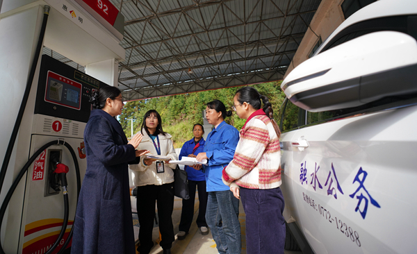 近日,广西壮族自治区融水苗族自治县纪委监委会同县公务用车管理服务中心,通过查阅台账资料、实地走访等方式,对公车维修、加油等情况开展检查,严查违规使用公车等问题,持续纠治“车轮上的腐败”。图为11月19日,在融水苗族自治县洞头镇某加油站,纪检监察干部在核查公车加油情况。 龙林智 摄