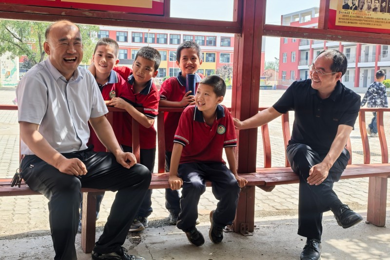 灵沙乡九年制学校的学生午餐后与老师聊天
