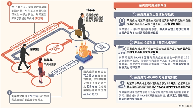 其中,2013年至2018年,荣虎成利用职务便利,多次为妹夫刘某某承接工程项目提供关照。2018年7月,荣虎成欲购买某定融产品(政府定向融资产品、收益固定无风险),因自有资金不足,荣虎成考虑到此前为刘某某打招呼承接工程项目使其获利颇丰,遂与刘某某商量让其帮忙出一部分资金,刘某某当即表示要送给荣虎成50万元,荣虎成将自有资金70.335万元转账给刘某某。刘某某以自己的名义购买了某定融产品120万元(刘某某实际送给荣虎成49.665万元),并定期将该产品所产生的利息交给荣虎成妻子郭某某。